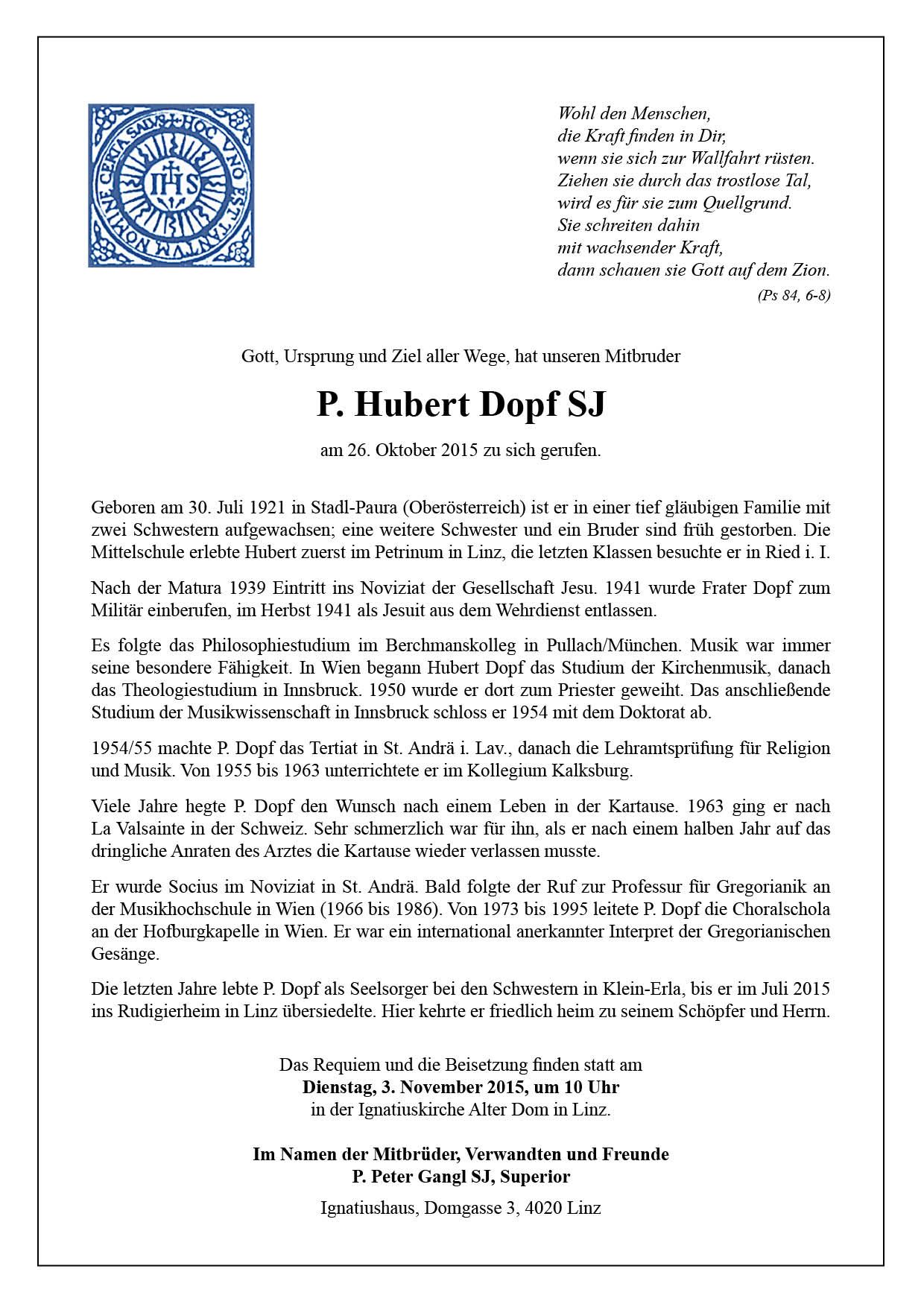 Im Gedenken an +P. Hubert Dopf SJ